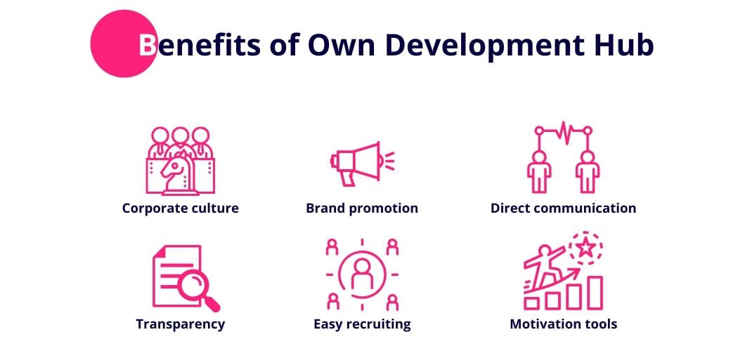 Another advantage of opening an R&D hub is your own branded office and corporate culture. Considering that there are no third parties when it comes to employment, you can select people with the right mindset to be part of your team, share common values, follow universal corporate policies, and pursue the same goals. All these points can boost your employer branding and make offshore recruitment far less challenging.