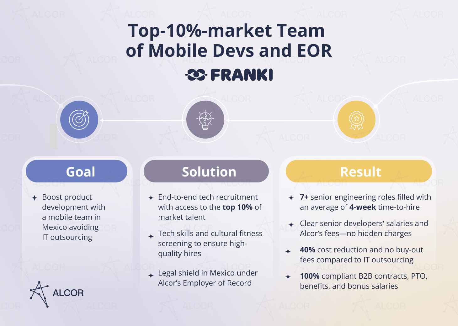 Want to scale your tech product team in Mexico fast, 100% compliant, and with no hidden costs? Franki, a California-based startup, answered yes to this question and contacted Alcor. The deal was sealed right away.