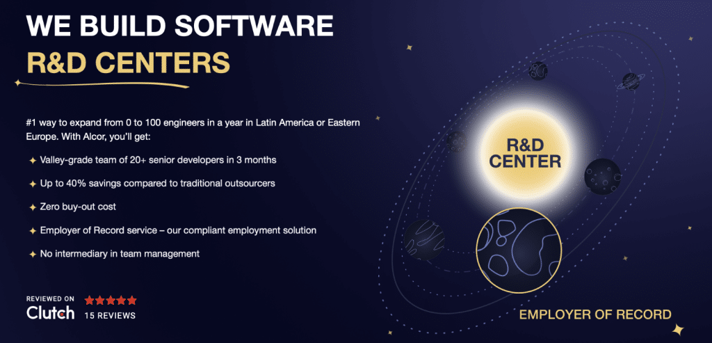 We’re not traditional outsourcing, we’re not pure EOR service, and we’re definitely not just recruiting. Alcor is an all-in-one place to build and run a software engineering team of TOP talents overseas: