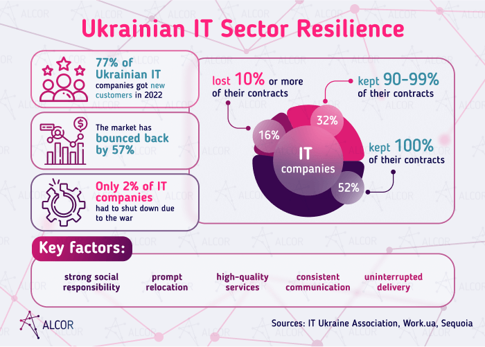 Despite these challenges, it’s noteworthy that 52% of IT companies kept 100% of their contracts, while 32% of businesses kept 90–99%. The results indicate that only 16% of companies lost 10% or more of their contracts. Additionally, 77% of IT companies have got new customers, and 56% expect 5–30% growth this year. The key factors contributing to such resilient recovery include high social responsibility for IT engineers and their relocation, uninterrupted delivery and communication with clients, and high-quality services even in the face of war.